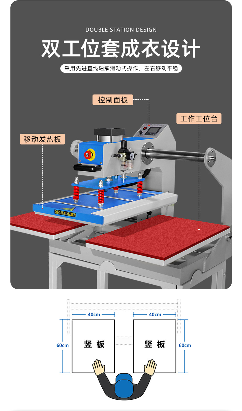 半自動(dòng)氣動(dòng)雙工位燙畫機(jī)KY-7B-1套成衣      操作方式:1、開機(jī),設(shè)置溫度,時(shí)間,底板固定不動(dòng),將成衣套在底板上;2、推動(dòng)手柄,移動(dòng)發(fā)熱板觸碰到高靈敏行程開關(guān),發(fā)熱板自動(dòng)下壓;3、燙印結(jié)束后,發(fā)熱板自動(dòng)升起,無(wú)需人為拉起發(fā)熱板,燙印